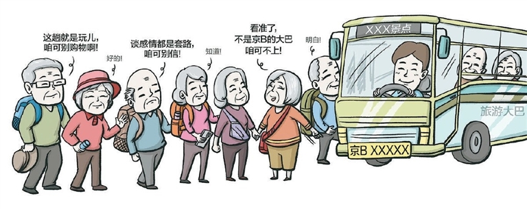 目前市场上,有一些人专做社区产品。他们会发展几个老年人当组织者,以免除费用为好处,让这些老人拉拢更多人成为客户。这其中有正规导游,也有私下组织。“有些团队游甚至使用非运营性质的大巴。老人们一定留心,在北京,不是京B牌照的大巴,属于非运营车,出游尽量别选择。”