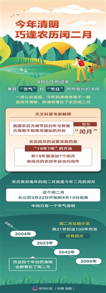 “清明在公历年中的日期是基本固定的,绝大多数年份为4月5日,个别年份为4月4日或4月6日,而闰二月的时间一般在公历3月下旬至4月中旬,所以有闰二月的年份,清明必定落在闰二月里。2004年和2023年的清明落在闰二月十五,2042年和2099年的清明落在闰二月十四。”杨婧说。