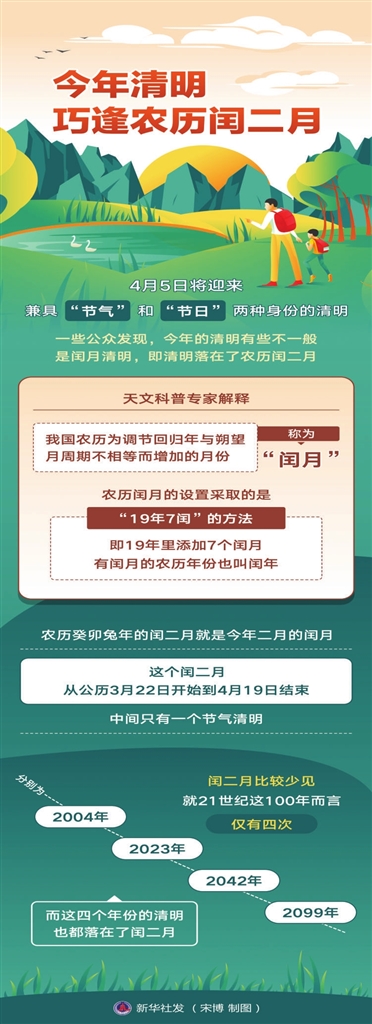 闰二月比较少见,就21世纪这100年而言,仅有四次,分别为2004年、2023年、2042年和2099年,而这四个年份的清明也都落在了闰二月。