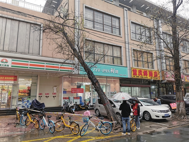 行道树雨中倾斜 网格员协调处置
