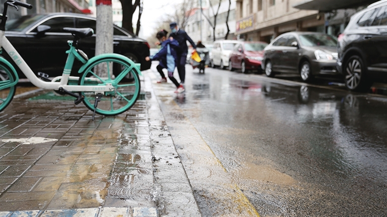 4月4日,桃园正街桃园路一社区卫生服务站前人行道路面出现冒水。12319热线表示将尽快核实维修。 张耀森 摄