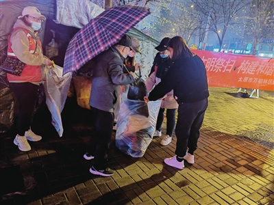 为践行移风易俗、绿色、文明安全的祭扫新风尚,万柏林区小井峪街道小井峪社区发起“文明祭扫”倡议,网格员在清明节到来之前,为辖区居民发放焚烧袋等物品,告知大家何时何地进行祭扫,将“推行文明祭扫,构建和谐社会”的宣传条幅悬挂于街道显眼位置,将事先准备好的塑料袋与焚烧袋放置在祭扫点帐篷内,供居民使用。 杨沫 魏利 摄