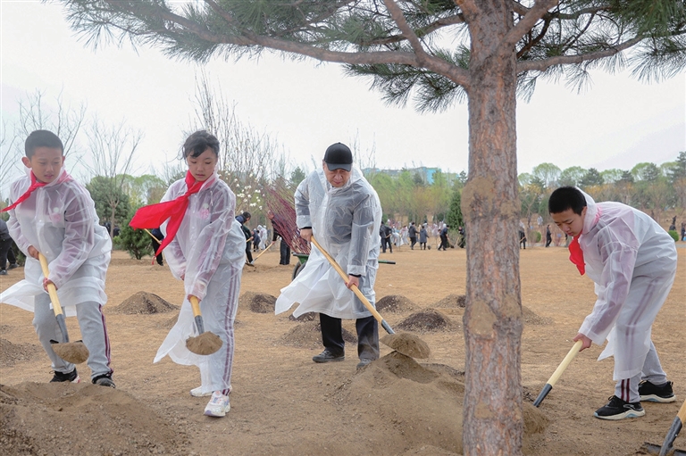4月4日,党和国家领导人习近平、李强、赵乐际、王沪宁、蔡奇、丁薛祥、李希、韩正等冒雨来到北京市朝阳区东坝中心公园参加首都义务植树活动。这是习近平同大家一起植树。 新华社 发