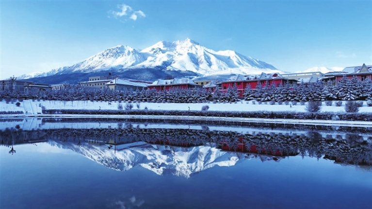 受强冷空气影响,4月1日至2日,青海省出现降雪降温吹风天气,气象部门启动寒潮Ⅲ级应急响应,发布寒潮黄色预警。5日,在位于祁连山腹地的青海省海北藏族自治州祁连县,摄影爱好者拍摄到春雪覆盖山峦、森林的壮美画面。画面中群山被白雪覆盖,墨绿色的松柏枝头挂满白雪,蓝天、白云、山峦、森林构成一道美丽的风景线。图为美丽的雪山倒影。 中新社 发