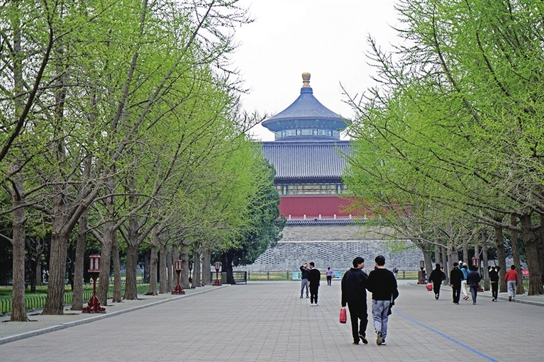 天坛 4月2日,游客在天坛游览。天坛始建于明永乐十八年(1420年),是世界上现存规模最大、保存最完整的古代祭天建筑群,1998年被列入世界文化遗产名录。