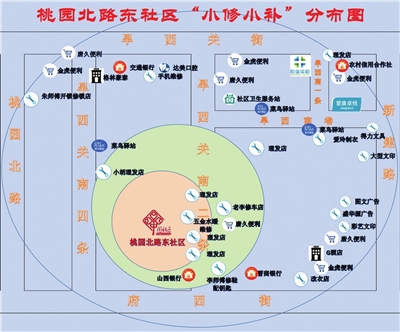 “这张分布图真是太棒了!家门口各类维修店铺的位置一清二楚。”当天上午10时许,70岁的彭秀娥大娘看到桃园北路东社区绘制的“小修小补”分布图后不断点赞,还不停地向邻里街坊推荐。