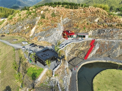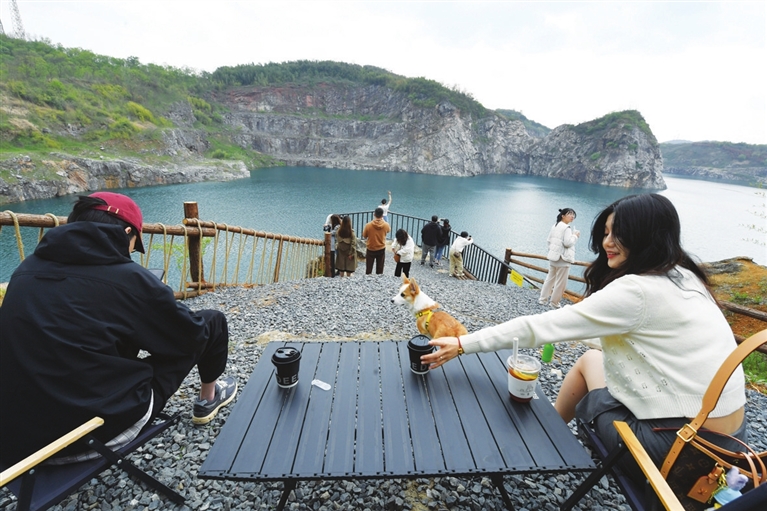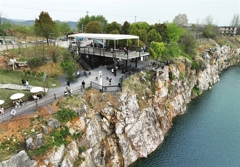 这是4月7日拍摄的安吉县梅溪镇红庙村一处废弃矿坑旁的深蓝计划咖啡馆。