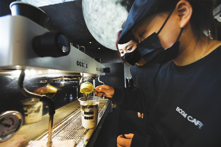 4月7日,安吉县上墅乡罗村一咖啡馆的工作人员在为顾客制作饮品。