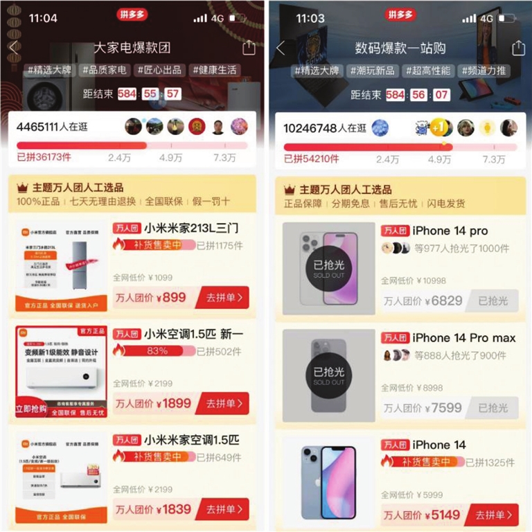 每年4月份都是数码家电品牌进入旺季的开端,也是消费者换新的时节。为了同时惠及用户和品牌,拼多多万人团还联合小米、海尔、美的、海信、TCL等品牌旗舰店,共同推出了“数码爆款一站购”“大家电爆款团”“小家电,大放价”等主题活动,上百款数码家电产品同时开团。目前,该活动已吸引了近2000万人次,苹果、小米等多款产品售罄并紧急补货。