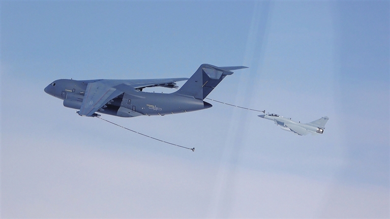 战区空军数十架歼-16、歼-10C战机挂载实弹,在预警机、干扰机、加油机引导支援下,展开多波次中远距空战对抗。各型战机混合编组、灵活布势,运用干扰压制、占位阻击等方式,对“敌”空中兵力实施快速寻歼,有效夺取并保持任务空域制空权。
