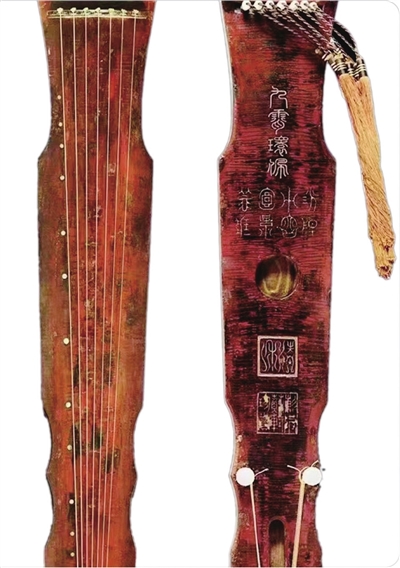 “九霄环佩”古琴通长124cm,额宽21.8cm,尾宽15.4cm。琴背阴刻“九霄环佩”四字,另有“东坡苏轼珍赏”篆文印。音质苍古,是唐代古琴中的佼佼者。