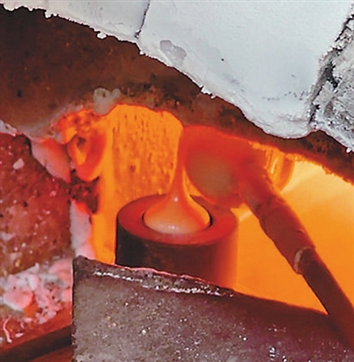 站在内温1200摄氏度的窑炉边,热气扑面而来。刘廷举的徒弟右手持圆头铁杆伸进窑炉、蘸满熔浆,快速滴落在左手中的细长铁板上,再利落地翻手收料。熔浆遇到铁板,初时赤红,随即变为乳白色,终至冷却,一颗正圆扁平的云子便具雏形。