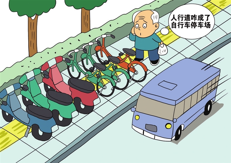 近两年,街头的电动自行车数量越来越多,加上共享单车,这让非机动车停车难的问题日益突出。为此,不少地方在步行道外侧划出了非机动车停放区,不过一些停车区却设置在了原本就狭窄的人行道上。车虽然有地儿停了,行人却没地方走了,产生了“车在步道停,人在车道走”的怪现象。(《北京日报》4月10日)