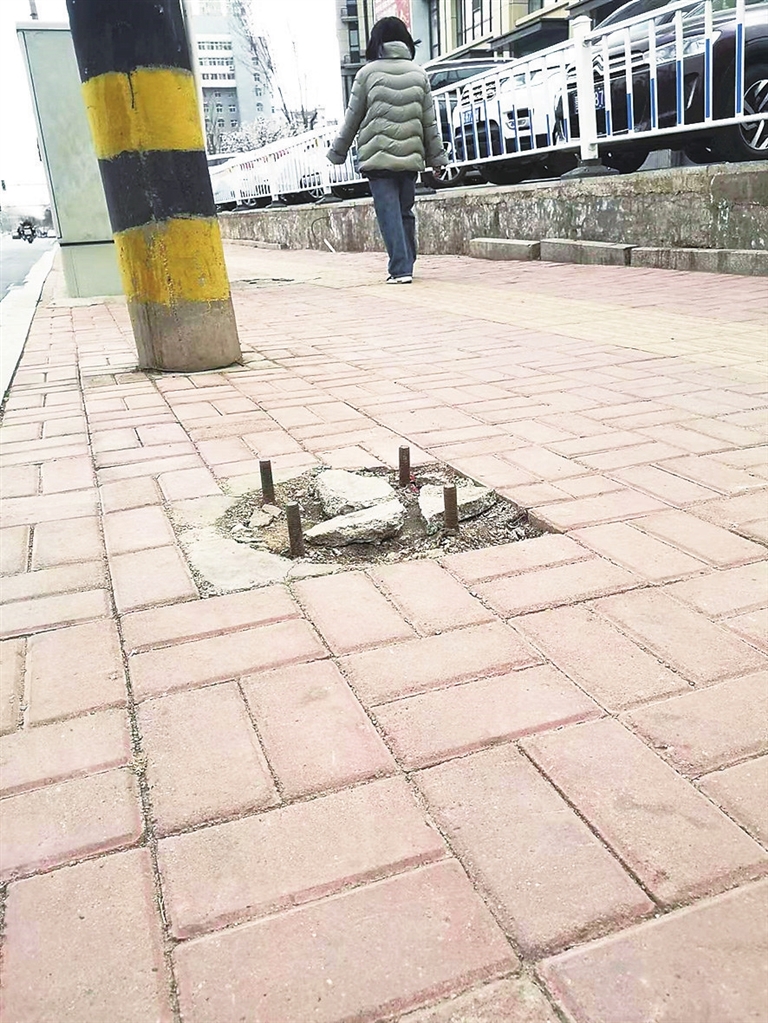 拍摄经过:4月10日,我途经千峰北路与后北屯街交叉口西北角便道时,看到便道上立着四根拇指粗细的钉子,应该是路灯杆被拆后留下来的,希望相关部门尽快处理。