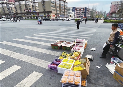 4月11日,文兴路永乐北街口,商贩在斑马线上叫卖,影响正常通行秩序,造成安全隐患。