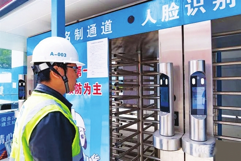 从写字楼向西,几百米外一处建筑工地被围挡封闭,面向人行道的一侧留有“实名制员工通道”。两扇旋转门边,一人多高处分别装有摄像头,醒目的提示语写着“实名登记,刷脸进出”。
