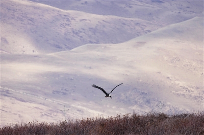 4月12日,黑鹳在色达县康勒乡河滩边展翅飞翔。