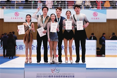 4月13日,冠军黑龙江省冰上训练中心选手张思阳(左三)/杨泳超(右三)、亚军齐齐哈尔市冬季运动项目中心选手张嘉轩(左一)/黄一航(左二)和季军黑龙江省冰上训练中心选手赵婉彤(右二)/刘宇航在双人滑颁奖仪式上。当日,在山东青岛举行的2022/2023赛季全国花样滑冰冠军赛双人滑比赛中,张思阳/杨泳超以178.77分的总成绩夺得冠军。 新华社 发