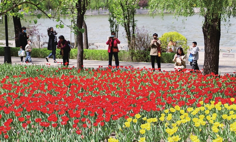 4月16日,迎泽公园的郁金香如约盛放,为春日的太原增添了别样风景,吸引众多市民前来赏花踏青。张昊宇 摄