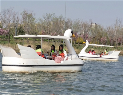 4月16日,春光正好,游人泛舟晋阳湖,尽情享受美好的休息日。