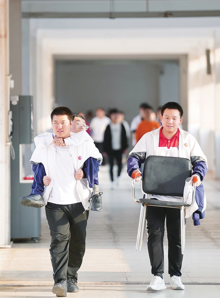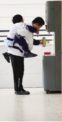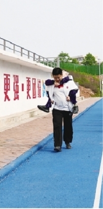 钟华强患有先天性脑瘫,双腿无法正常行走。进出教室、校园散步、上下楼梯、打水,上体育课……10年时间,朱金祥一直充当着钟华强的“腿脚”,背着他一起长大,成绩优异的钟华强在学习上也常常帮助朱金祥。