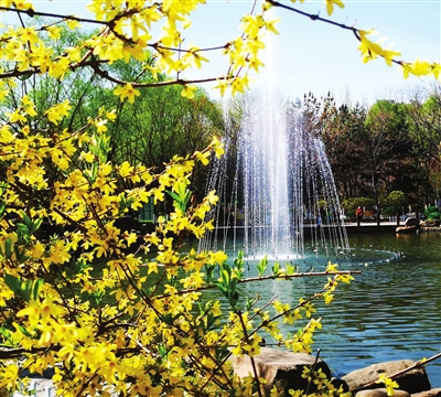 春风送暖,漪汾公园里的喷泉在连翘花的映衬下,喷珠吐玉,带给人春光无限好的美好感受。