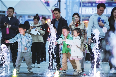 4月17日,我市最高气温达31℃,晋阳湖周边的灯光喷泉开放,引得孩子们嬉戏玩耍。市气象台提醒,本周气温变化较大,请市民及时增减衣物。