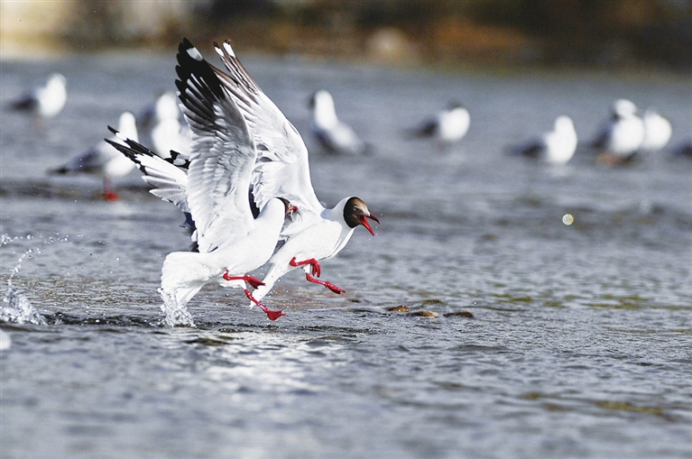 棕头鸥在拉萨河上嬉戏(4月16日摄)。