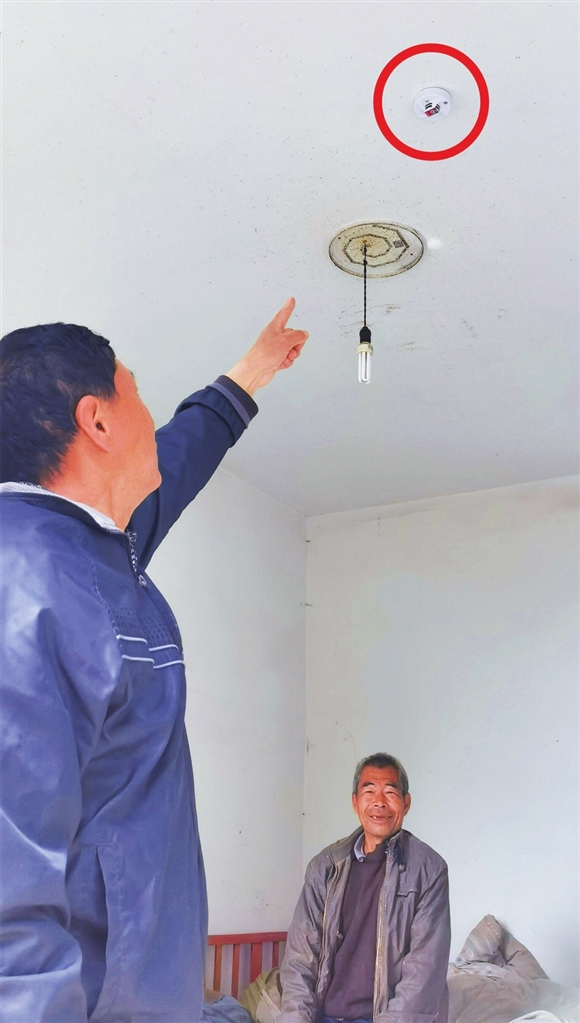一个小小的、圆形白色装置,被镶嵌在屋顶中央,不仔细观察甚至看不到,但它的作用却不可小觑。在村民温五生家里,他的哥哥向记者表示,政府安装“感烟器”后,让他感到放心了。