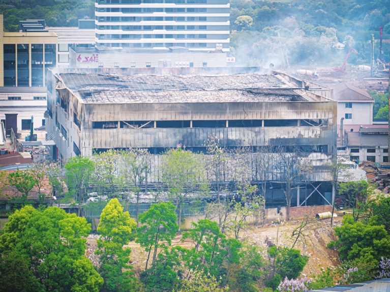 这是4月18日拍摄的金华市武义县浙江伟嘉利工贸有限公司厂房火灾现场(无人机照片)。 新华社 发