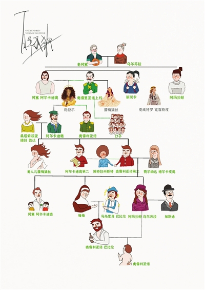 “我意识到,首先要消除大众对这部书庞杂的人物关系的恐惧。”李燕飞发挥曾是平面设计师的优势,厘清了《百年孤独》中的人物形象图谱和场景图示,并按动画的方式进行条理剪辑。