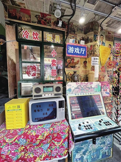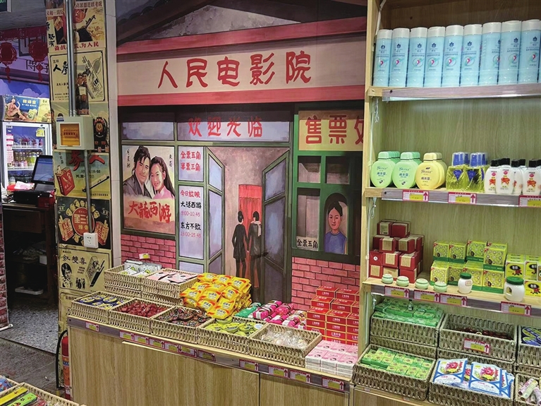 怀旧经济的“钞能力”在其他领域也不容小觑。在食品街一家童年零食杂货铺内,许多大人带着小孩,一边触摸老物件,一边挑选喜欢的零食。店内背景音乐循环播放着小虎队的老歌,墙上怀旧海报仿佛能让顾客“一秒穿越”。无花果、唐僧肉、济公丹、劲跳糖、白瓷缸……小到零食、日用品,大到室内布置的旧场景和老物件,无不增添浓浓的往昔情怀。