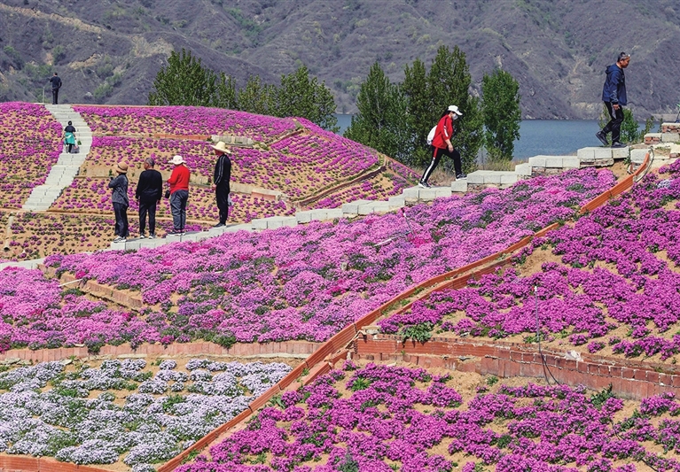 4月19日,游客在河北省迁西县旧城乡雨花谷生态观光园赏花。