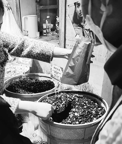 距离南口不远,有一个杂货店,卖的多数是怀旧商品,如“80后”小零食、小玩具等。店面深处,传来一阵花果香味,店员热情地端着一次性小塑料杯,请进店的游客品尝一种紫红色的花果茶。