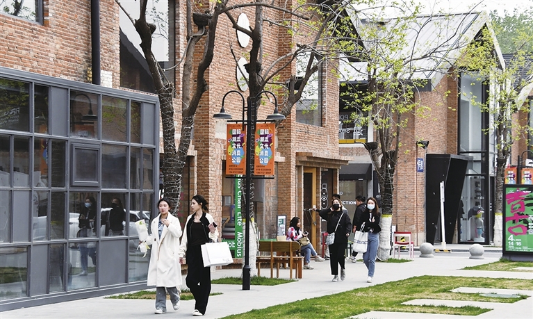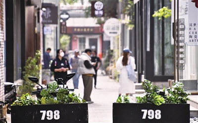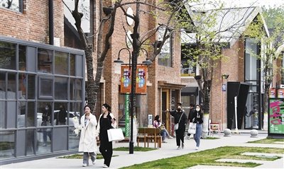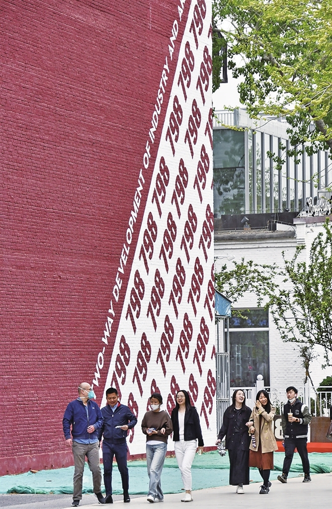 4月12日,游人在老旧厂区改造的798艺术区内参观。