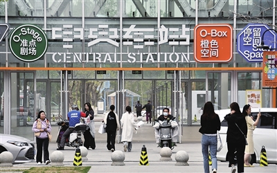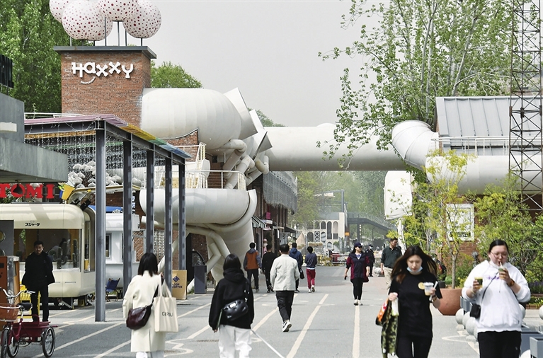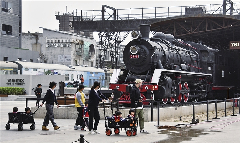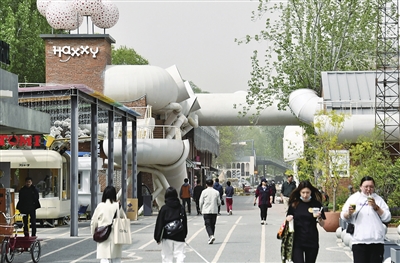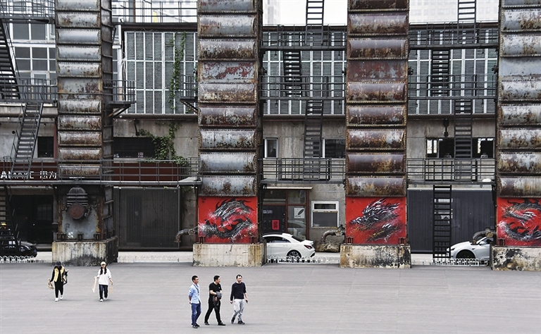 游人在751时尚设计广场园区内参观工业遗迹和设施。