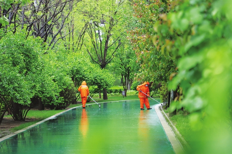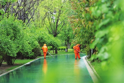 4月21日,省城迎泽公园环卫工人冒雨作业,清理公园路面积水、淤泥。 张昊宇 摄