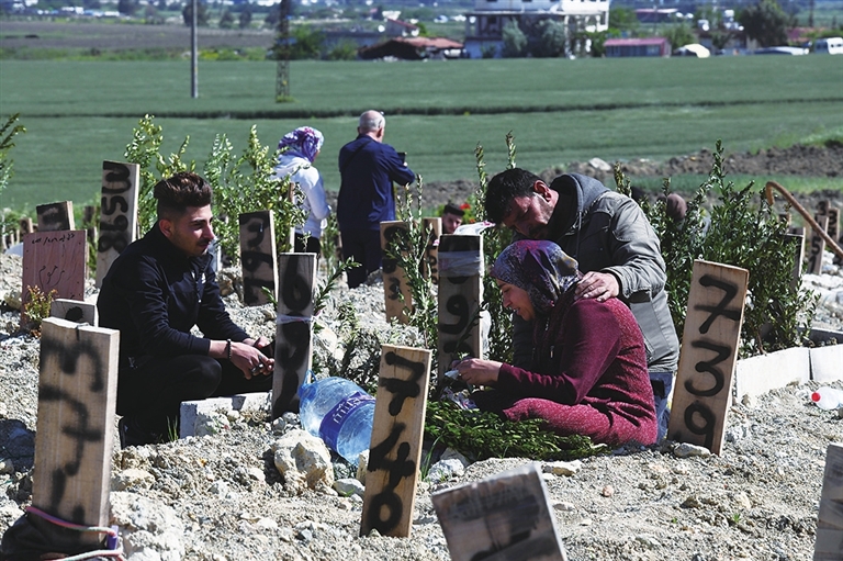 哈塔伊省的安塔基亚市是本次地震中受损最严重的城市之一。假期第一天,众多安塔基亚市民前往墓地悼念遇难亲人。他们在亲属墓前摆上鲜花,默默祈祷。在一片墓地,记者看到一名中年妇女跪在一座石碑旁,掩面哭泣。墓碑上的碑文刻着遇难者生于2007年1月7日,卒于2023年2月6日。她16岁的女儿在地震中不幸遇难。