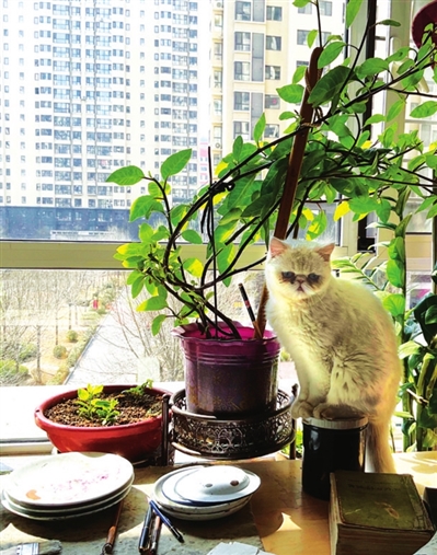 每天,老伴走到哪里,小白猫就跟着他到哪里。它还特别偏爱老伴的书桌,每每看到老伴要开始学习了,就一跃身跳上去。不是把画桌上一个洗毛笔的大瓶子作为制高点,站在那里看着老伴,就是伏在画毡上、书上,盯着老伴的一笔一画。要不转过身去,看着阳台上种的那些绿色蔬菜,看着窗户外面的大千世界……