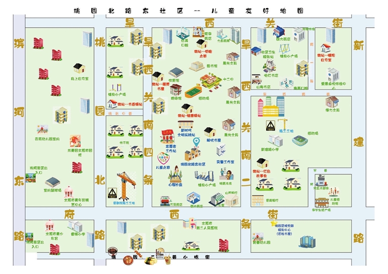 春天是太原最美丽的季节,也是最适合儿童外出活动的季节。近段时间,桃园北路东社区开展了不少适合儿童参加的活动。家长带着孩子参加活动时,时常询问在社区内以及周边有哪些适合儿童活动的场所。为此,受“小修小补分布图”启发,社区工作人员又绘制了一幅“儿童友好地图”。