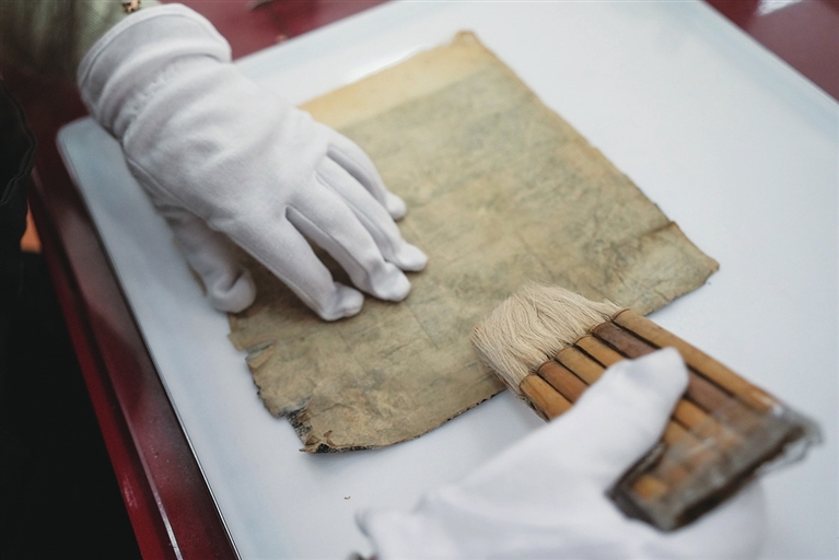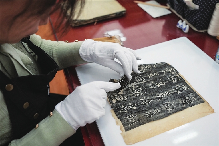 从拆书皮、揭书叶、书叶去污,到配纸、订线,王斌跟师傅学习古籍修复、线装书制作等专业技艺。如今,古籍修复技艺的数十道工序王斌已熟记于心。根据损坏程度,一本古籍的修复时间少则几周,多则一年,每一步都要谨慎,不能出错。王斌说:“每当开始修复工作时,我都需要静下心来。修复的过程中,通过古籍我仿佛能与古人隔空对话。”