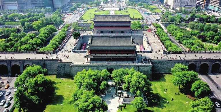 西安明城墙永宁门(4月25日摄,无人机照片)。