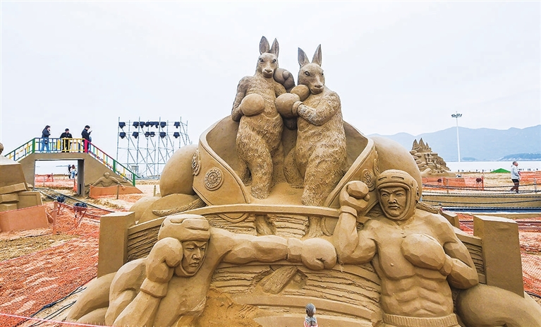 4月25日在舟山市朱家尖南沙景区拍摄的亚运主题沙雕作品。
