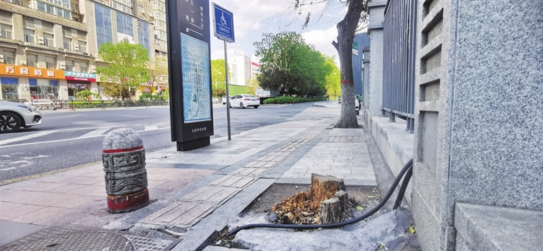 4月27日,府东街杏花岭一条附近,一个树桩留在地面,为行人带来安全隐患。 李杰华 摄