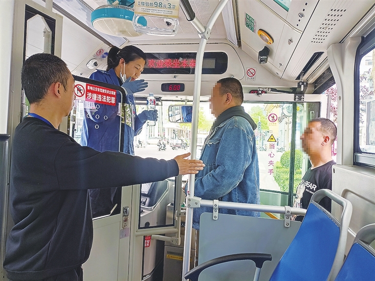 乘坐公交车不可携带易燃易爆品,但有个别乘客偷带酒水上车。4月25日上午,长治路南中环街口公交站,一名乘客将酒装入矿泉水瓶想蒙混过关,被G7路公交车驾驶员高扬和随车安全员发现,并及时劝阻。 郭晓华 李静 摄