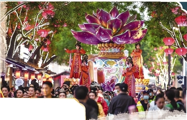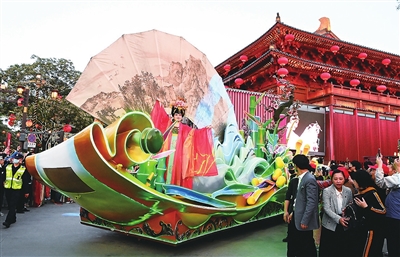 4月25日,花车巡游在西安大唐不夜城步行街举行。