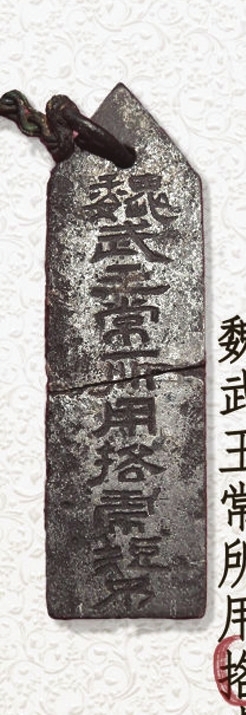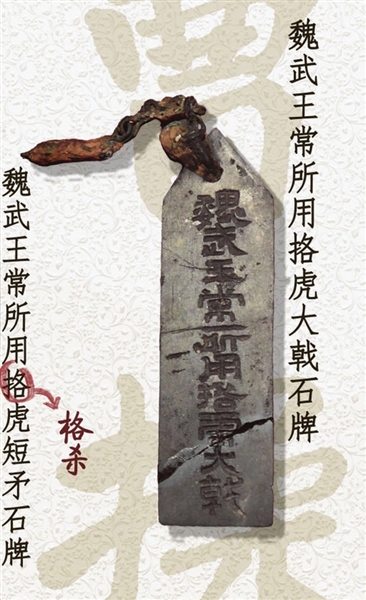 历史上曹操墓曾多次被盗,石牌为曹操墓随葬器物的标签,其中8块石牌提及兵器,说明墓中曾随葬导、从、长、短兵四类武器。