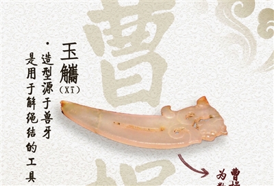 造型源于兽牙是用于解绳结的工具,也是曹操墓出土的为数不多的玉器。玉觿上可明显看出使用痕迹,专家推测,应为曹操常用物件。