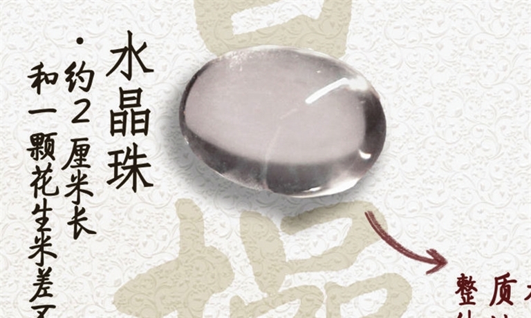 约2厘米长,和一颗花生米差不多大小,水晶材质、质地纯净、整体通透。有专家推测,这可能是口含珠,但具体作何用,还待研究。