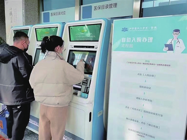 不用预约、不用排队,只需在自助机上输入住院号、身份证号,完成住院押金缴付等几步简单操作,就可以打印出住院腕带,轻松入院。在山医大一院1号住院楼的服务大厅里,记者见到了正在尝试使用自助机的方大爷,一旁还有咨询员一步步指导大爷操作。山医大一院上线运行了自助住院服务设备,率先在省内开启自助入院模式,以“智慧方式”让患者少跑路、少等待。而且针对老年人等不习惯使用自助设备的人群,住院部还安排了导引咨询员,主动为住院患者提供首站接待、入院导引、协助办理等服务。自助设备越来越“全能”,就医流程简化了,患者就医也更方便了。